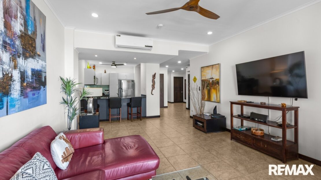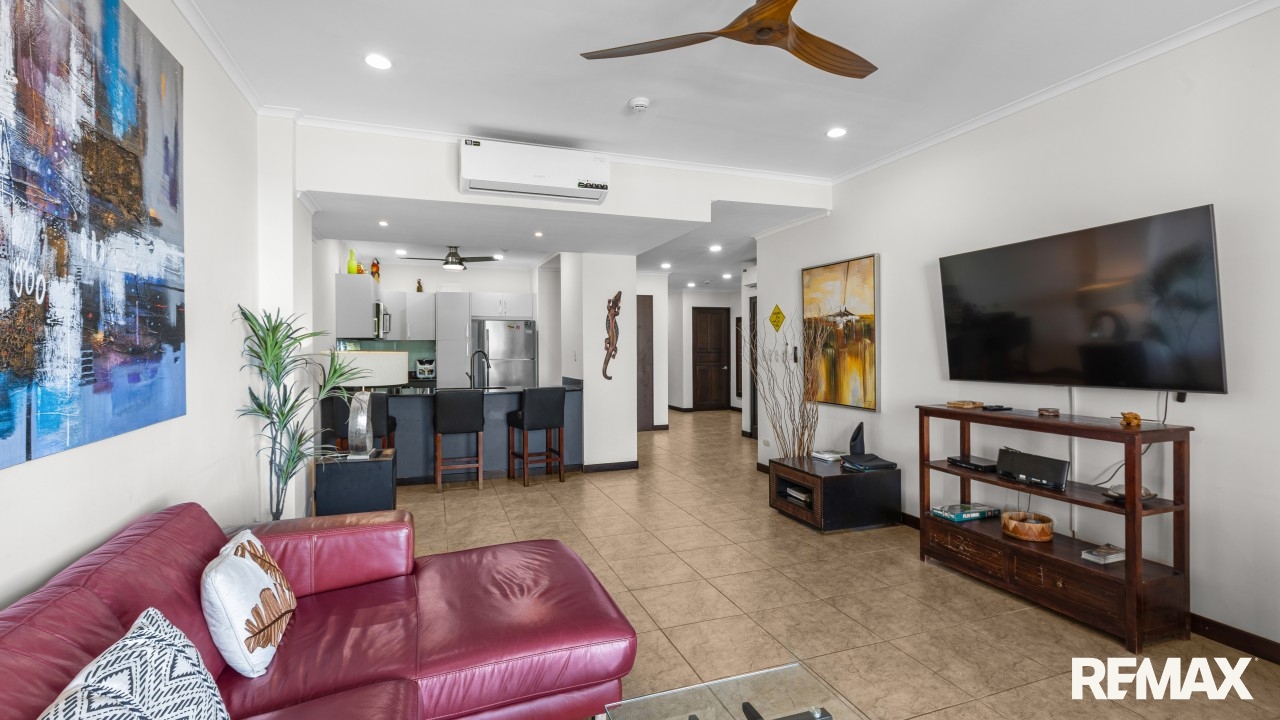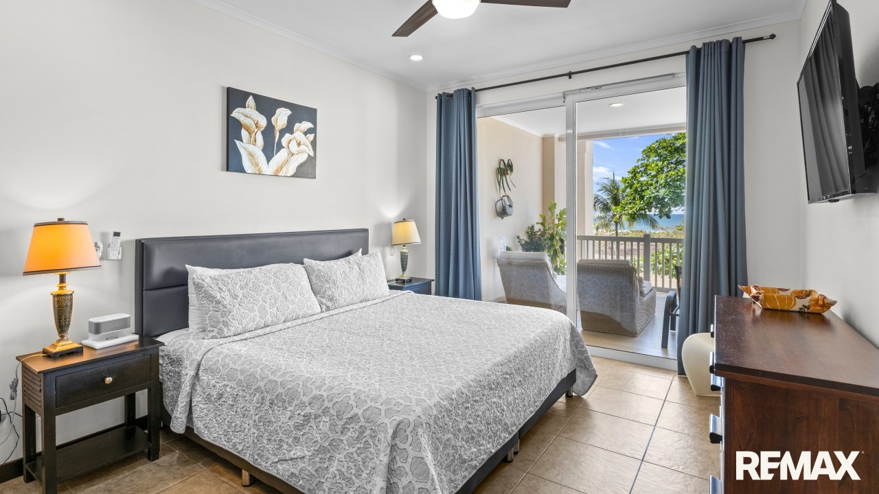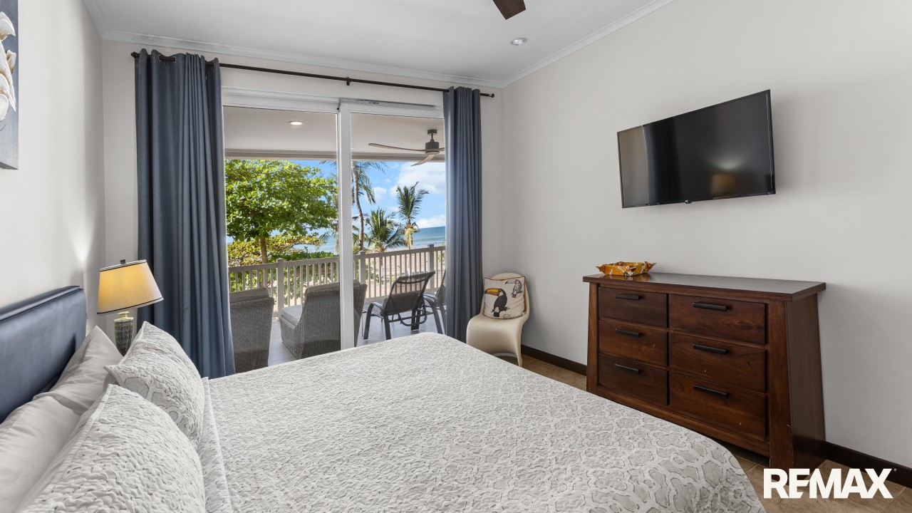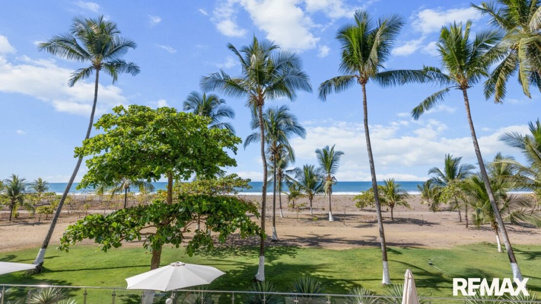 The Palms 203 is a direct oceanfront condo located on the 2nd floor of the Palms building in Jaco Beach. This spacious residence features 2 bedrooms, 2 bathrooms, and 138 m² (1,485 square feet) of well-designed interior living space, complemented by one of the largest oceanfront terraces in Jaco.